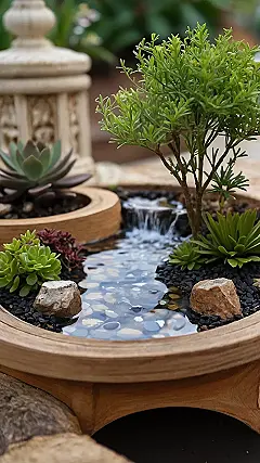 This miniature garden design is seriously adorable! It’s like having your own personal zen garden, but way cooler. Look at that teeny waterfall cascading down into a little pebble river – it’s practically a tiny vacation spot for some super chill succulents! I bet the tiny plants love their stylish home, and it probably smells amazing if they’re real plants. It’s the perfect project for someone who wants a beautiful, low-maintenance, and utterly charming decoration. You could totally make one yourself, and imagine the bragging rights!