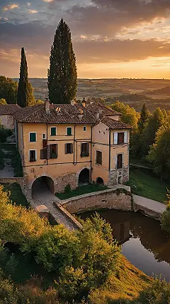 Stepping into this scene feels less like visiting a place and more like crashing a painting that came to life. You’ve got this amazing old building looking all grand, probably full of secrets or at least dusty furniture, sitting right there in the middle of nature doing its absolute best. Those super tall, skinny trees look like they’re guarding the place, while the rolling hills in the background are showing off like, “Yeah, this is just our casual view.” It’s the perfect example of how Europe mixes history with ‘wow, look at that view!’ nature spots, proving that sometimes, the coolest green spaces come with seriously cool architecture.