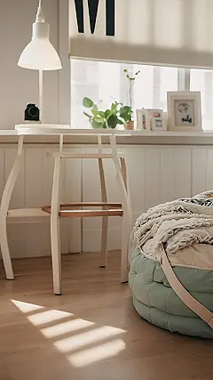 This room is seriously adorable! Imagine waking up to sunshine streaming through the window, making stripes on your floor like a giant, magical cat’s whiskers. You’ve got a comfy-looking beanbag chair perfect for chilling with a good book or binge-watching your favorite shows. Plus, a little desk area for studying or sketching out your awesome art ideas – it’s the perfect blend of relaxation and productivity. This room is so dreamy, you might just fall asleep while doing your homework!