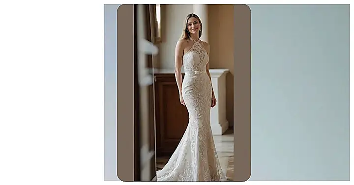 Get ready to swoon over this stunning bridal dress, perfect for setting the ‘bridal dress trends 2026’ bar high! That beautiful halter neckline, practically dripping with pearly goodness, is a total showstopper. And the intricate lace detailing on this fitted gown? It’s like someone wove pure elegance right into the fabric, making sure you look like a total star. Plus, with a sleek silhouette like this, you won’t have to worry about accidentally tripping over a giant skirt on your way to the cake – total win for everyone!