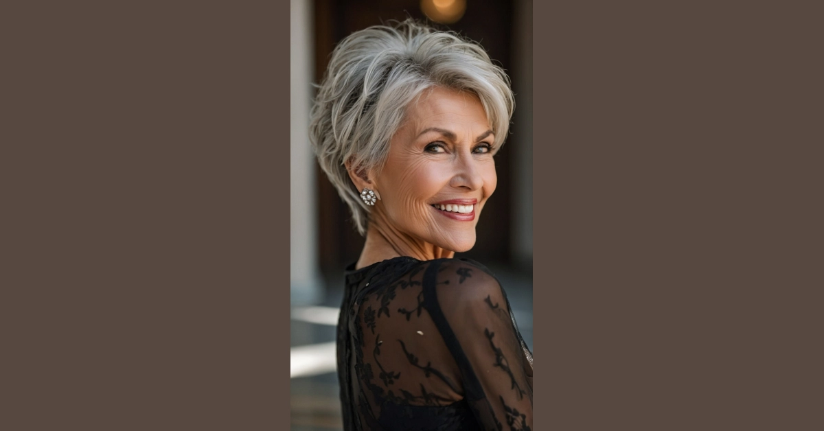 This lady is rocking a super cute hairstyle that totally makes her look like a sassy silver fox! It’s short and choppy, which is perfect for showing off her beautiful face and those gorgeous eyes. Plus, it’s super easy to style – just a little bit of product and she’s good to go. It looks like she’s just ready to own the day!
