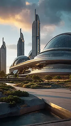 Imagine a world where buildings are like giant spaceships, all sleek and curvy with windows that shine like diamonds. This picture is like a peek into that future, and it’s super cool! The buildings look like they’re from a sci-fi movie, with their smooth lines and funky shapes. They’re so futuristic, it’s almost like they’re ready to blast off into space.
