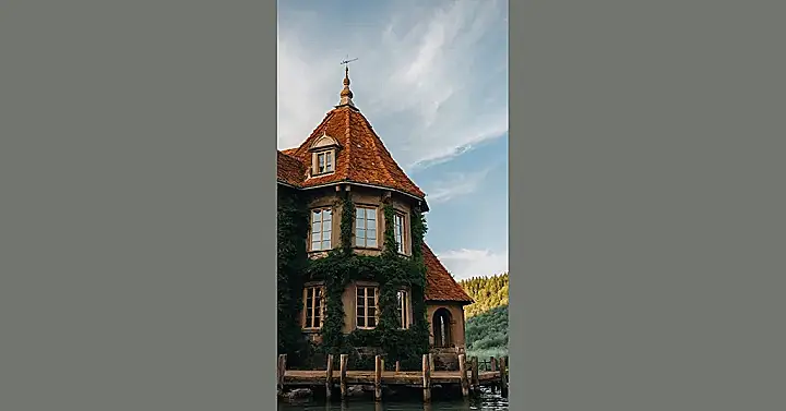 You’re looking at a house that clearly decided “normal” was overrated! With that super cool, kind of wonky roof and all the ivy climbing up its walls like it’s trying to give the whole place a giant, green hug, this isn’t your average suburban home. It honestly looks like it belongs in a storybook, maybe one where a friendly wizard lives or a prince occasionally docks his boat for a quick tea break. And just imagine having that little wooden pier right outside – perfect for dipping your toes in the water or saying hello to any passing swans!