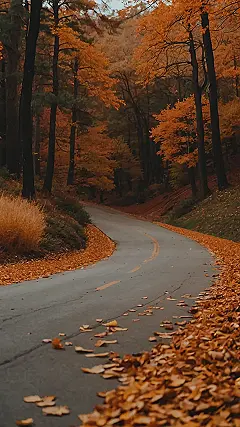 This picture makes you want to grab a cozy blanket, a pumpkin spice latte, and drive down that winding road. Just imagine the crisp autumn air and the leaves crunching under your tires as you cruise past that cute little house. The way the trees are all ablaze with colors makes it look like a fairytale setting, perfect for a relaxing drive through the fall foliage.
