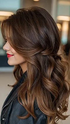 Ready to swap those summer beach waves for something a little more ‘cozy chic’ this fall? Just look at this hair, serving up major autumn vibes! Those rich, chocolatey brown strands, gently kissed with warm caramel highlights, are basically begging to be featured in every fall selfie. And those waves? They’re so perfectly bouncy, it’s like they spent all summer doing yoga and now they’re super flexible. You know, the kind of hair that looks effortlessly amazing but probably required a whole team of styling products and a curling iron that deserves an award.