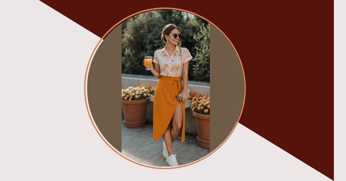 This pic shows how to totally nail the picnic outfit game, serving up serious style alongside what looks like a refreshing glass of sunshine! That super cute floral top paired with a flowy mustard skirt is practically glowing, and let’s not forget the genius touch: comfy white sneakers. This look screams “I’m stylish, but I can also totally outrun that bee if it comes for my sandwich,” making it perfect for both chasing after a runaway frisbee and just trying not to trip over uneven ground (we’ve all been there). The skirt slit adds a breezy touch, ideal for those sunny outdoor adventures.