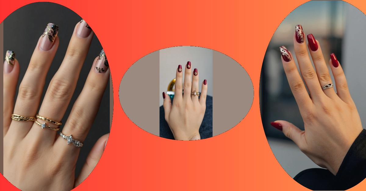 Those nails are rocking a seriously chic burgundy shade, perfect for the autumn vibes! It’s like the color of a cozy sweater and pumpkin spice latte all rolled into one. And that ring? It’s like the cherry on top of your fall-tastic look! It’s giving off some serious “I’m ready for sweater weather and pumpkin carving” vibes.