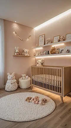 This newborn room looks like a giant fluffy cloud collided with a toy factory! The soft pink walls and gentle lighting create a vibe so cozy, you’d want to curl up right on that plush rug yourself. Seriously, look at all those teddy bears and bunnies just hanging out on the shelves and the floor, looking ready for a cuddle party. It’s like this room was specifically designed to be the official headquarters of ‘Adorable Things’, making sure the tiny human who lives here is surrounded by nothing but softness and smiles (and maybe a little drool).