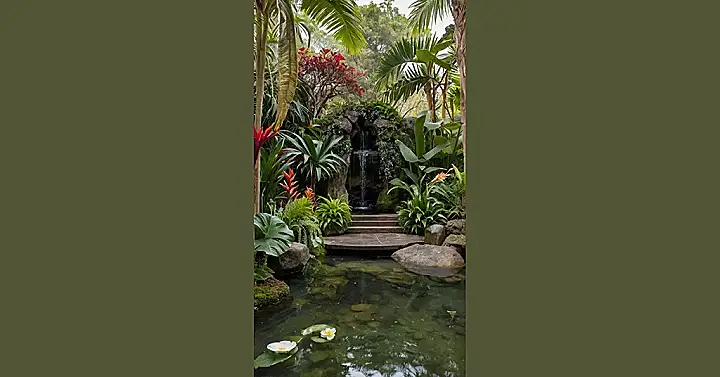 Picture this: you’re strolling through a lush, green wonderland, dodging enormous leaves and vibrant flowers that look like they’ve escaped from a rainforest movie. There’s a mini waterfall tumbling down rocks, creating a soothing soundtrack to your adventure. It’s like stepping into a postcard – but way cooler, because you can actually touch the plants (gently, of course, those are some serious ferns!). It’s the kind of tropical garden design that makes you forget all about homework and quizzes, if only for a little while.