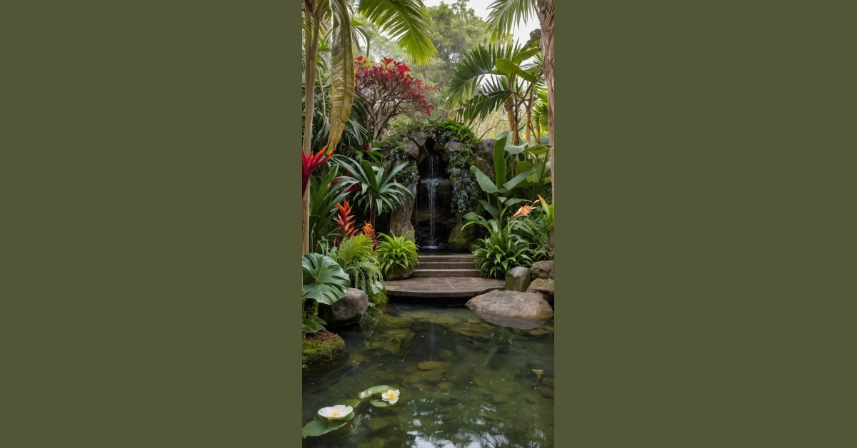 Picture this: you’re strolling through a lush, green wonderland, dodging enormous leaves and vibrant flowers that look like they’ve escaped from a rainforest movie. There’s a mini waterfall tumbling down rocks, creating a soothing soundtrack to your adventure. It’s like stepping into a postcard – but way cooler, because you can actually touch the plants (gently, of course, those are some serious ferns!). It’s the kind of tropical garden design that makes you forget all about homework and quizzes, if only for a little while.