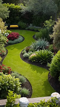 This picture shows a Canadian home garden that’s so neat, it almost looks like someone used a magic wand to make the grass grow in perfectly curvy lines! Imagine spending a sunny afternoon chilling on that bright yellow bench, watching bumblebees buzz around all the colourful flowers. It’s like a secret garden straight out of a fairytale, except instead of a grumpy gnome, you’ve got a seriously stylish seating arrangement. You’d probably never want to leave!