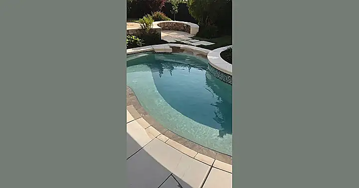 Imagine this: it’s a scorcher, and you’re chilling by your own private pool, a sparkling oasis in your backyard. This isn’t just any pool; it’s a total vibe, with fancy stepping stones leading to the water, a comfy spot to lounge by the side, and even a little built-in hot tub! It’s like having your own personal resort, right in your own home, perfect for epic summer pool parties, or just quietly reading a book in the sun. Who needs a vacation when you have this?