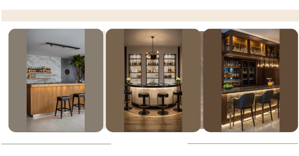 This particular house bar looks seriously cool and stylish, like something you’d see in a movie. It’s got a slick dark finish, and check out that awesome wooden paneling in the back with the zig-zag pattern – it even lights up, adding a bit of drama! Designing a house bar is all about making a little corner of your place look unique and feel like the perfect spot to grab a drink or just hang out with friends.
