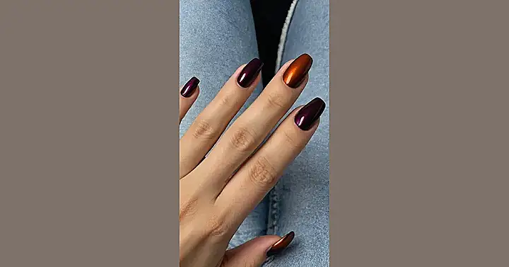 This picture shows off some seriously stylish nails that are perfect for the fall season. They’re a mix of rich, dark purple and warm, burnt orange – kind of like a spooky, glamorous pumpkin spice latte! The shiny finish makes them look extra fancy, and the colors are so trendy right now. If you’re looking for a way to spice up your fall look, try out this nail design – you’ll be turning heads everywhere you go!
