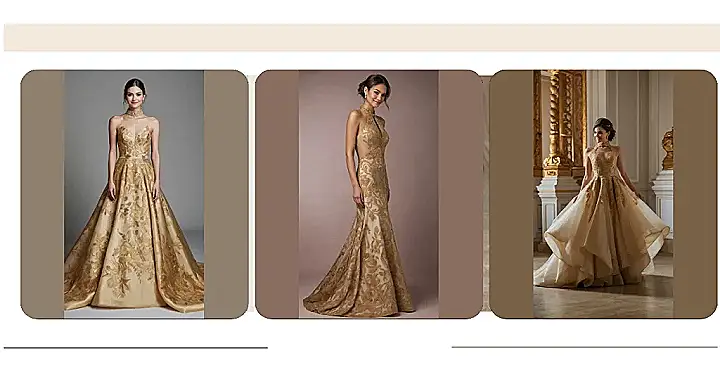 Seriously though, this dress is stunning. That gold embroidery is like tiny little works of art all over the creamy fabric, it looks super comfy and flowy. You could totally rock this look for a super special occasion, maybe even a destination wedding in a castle (if you’re lucky!). It’s the perfect blend of elegant and fun – a dream dress for anyone who wants to feel like royalty, without all the stuffy rules.