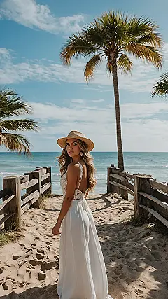 Getting that perfect beach pic isn’t just walking onto the sand and snapping away, unless you enjoy looking like a windblown mess with sand in your teeth. This photo gives us serious goals! Look at the chill vibe, the cool hat, the flowing dress, and those perfect palm trees photobombing just right. It’s like the wind decided to cooperate for five glorious seconds instead of trying to turn your hair into a bird’s nest while you blink dramatically into the sun. Definitely major beach inspo photography happening here.