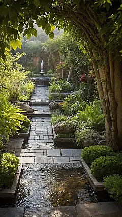 Looking at this super cool garden path, with its gentle waterfalls and lush green vibes, you might think it’s just for chilling out and taking awesome photos. And it totally is! This magical path, with its bubbling water and towering green canopy, looks like something straight out of a fantasy movie where elves might live. It’s so peaceful and perfectly designed, you almost expect a hidden door to open to a secret world. But let’s be real, how much cooler would it be if, instead of just pretty ferns, those plant beds were secretly growing ingredients for your next epic smoothie or a fresh salad? Talk about a personal snack bar!