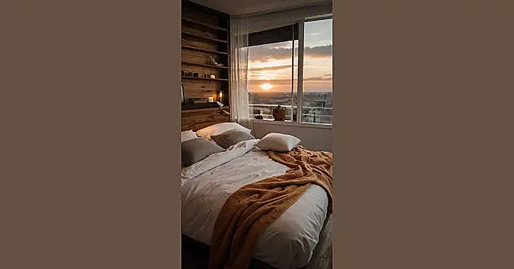 This bedroom is seriously chill vibes! Imagine snuggling under that cozy, burnt-orange blanket as the sun dips below the horizon. It’s like having your own personal sunset show every night, complete with comfy pillows and a view that would make even a grumpy sloth smile. Who needs a TV when you’ve got this gorgeous view? You could even build a pillow fort and have a super relaxing slumber party – though maybe skip the popcorn to keep things extra clean.