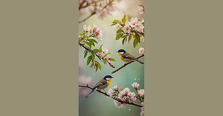 These birds look like they’re about to drop the hottest springtime album of the year, “Chirps and Blossoms.” Just imagine, they’re perched on a branch loaded with pink cherry blossoms, probably discussing the best spots for finding worms and whether they should get matching birdhouses. Who knew birds had such important decisions to make?