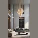 This living room looks like something straight out of a magazine! It’s so fancy and stylish, it almost feels like a palace! The giant chandelier is totally eye-catching, it’s like a sparkly cloud hanging from the ceiling. I bet the couch is super comfy, perfect for a movie marathon with friends.
