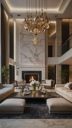 This living room is like something out of a fairytale! It’s got all the fancy stuff you’d expect in a palace: a giant, sparkly chandelier that looks like a bunch of golden flowers, a fireplace that’s warm and inviting, and even a marble wall that’s so shiny, it’s almost blinding. Imagine relaxing on one of those comfy sofas with a cup of hot cocoa while you watch the fire crackle and the chandelier glitters above you!