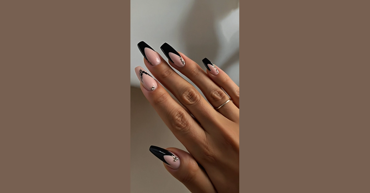 Check out these black nail designs! It’s like someone dipped their nails in liquid night and then bedazzled them with a sneaky stash of diamonds. The shapes are so long and sleek, you could probably use them to open envelopes… or maybe just dramatically point at your food in the cafeteria. Just be careful not to accidentally poke anyone’s eye out!