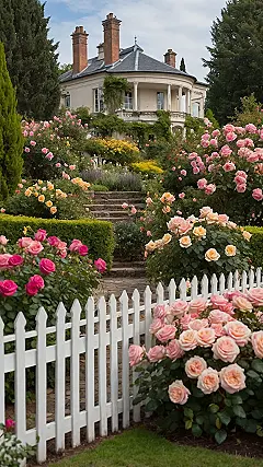 Step right up to this crazy colourful rose garden, where it looks like the roses had a party and decided to explode everywhere! Seriously, there are so many pinks, peaches, and yellows popping off that white fence, they’re basically trying to stage a friendly takeover. You can almost hear them whispering secrets to each other over the hedge, probably plotting which colour will be the most fabulous today or who gets to pose closest to the fancy house on the hill. They look like they’re having a grand time, maybe even giggling when someone gets too close to a thorn.