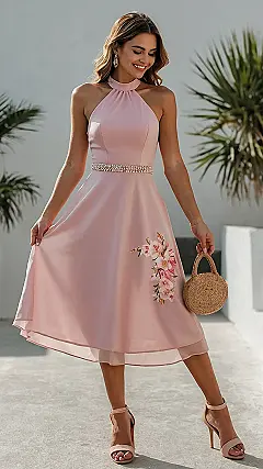 Seriously, who needs a magic wand when you have this dress? This isn’t just any light pink floral dress, it’s an instant confidence booster. The halter neck adds a touch of elegance, while the flowy skirt gives you that twirling-worthy movement. Picture this: you, in this dress, sunshine on your face, maybe a fun summer song playing…it’s the perfect recipe for a memorable day! You’ll be the belle of the ball (or the picnic, or the backyard BBQ—this dress works everywhere!).
