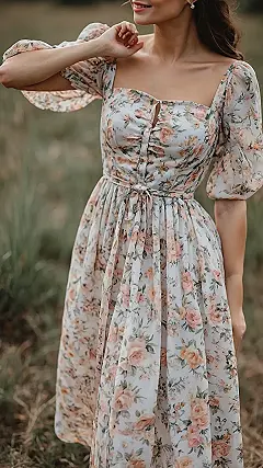 Wearing this gorgeous outfit, you’re not just dressed; you’re essentially bringing your own portable garden wherever you go. Who needs boring plain clothes when you can be a blossoming vision, turning a regular street into your personal runway? It’s the kind of dress that probably whispers secrets of sunny days and cool breezes, making you feel effortlessly chic whether you’re grabbing an iced coffee or secretly planning world domination. Plus, it’s long enough to hide that embarrassing spill from earlier – total win!