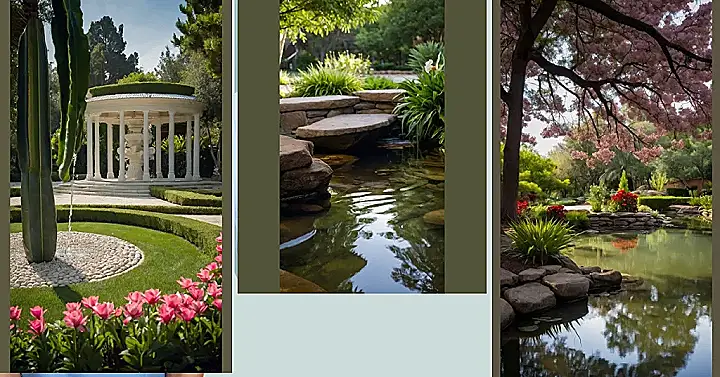 This garden is so serene, it’s practically whispering secrets to the flowers! Imagine sipping lemonade under that fancy gazebo, while a tiny waterfall tinkles like a wind chime. It’s like stepping into a picture book – all perfectly manicured lawns, pretty pink tulips, and a wise-looking cactus keeping a watchful eye on the whole scene. The only thing missing is a unicorn, but I bet you could totally convince your friends that one lives there, right?