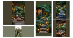 This garden is seriously dreamy! Imagine relaxing under that vine-covered archway as the sun dips below the horizon, painting the sky in gorgeous shades of orange and pink. It’s like a scene from a movie, but way more comfy. There’s even a fire pit for roasting marshmallows (or just warming up your toes!), plus cozy seating areas to chill with your friends. It’s the perfect spot for a peaceful evening, minus the grumpy garden gnomes.