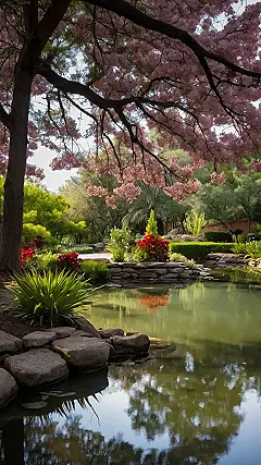 Seriously, look at those colors! The soft pink blossoms hanging over the peaceful water are so calming, it’s almost like the garden is whispering secrets to you. The vibrant red flowers around the pond add a little pop of excitement – like a sprinkle of confetti on a peaceful day. This is the perfect spot to relax, read a book, or just chill and let all your worries float away like those pretty pink petals on the water. I’d bet this place has some pretty amazing vibes, and could even inspire you to write your next big poem or hit song!
