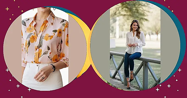 Check out this totally cheerful blouse outfit! That pink shirt covered in sunny orange flowers looks like it’s ready for a picnic or just making your day brighter. Wearing something this flowery basically means you’re bringing your own sunshine wherever you go. Pair it with some crisp white pants, and you’ve got a look that’s effortlessly cool and feels like spring break, even if it’s not.