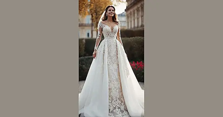 And let’s not forget that amazing, intricate lace that covers every inch, especially on those long, elegant sleeves and the seriously impressive train. It probably took a whole team of skilled designers (and maybe a few tiny fashion elves) to stitch all that beauty together! This kind of wedding dress might make you wonder if you can actually sit down or if you’ll need a personal assistant just to manage the train, but who cares when you look this absolutely stunning? It’s proof that a beautiful, well-fitted gown, maybe with a little hidden corset support, makes a bride shine like a superstar on her big day.