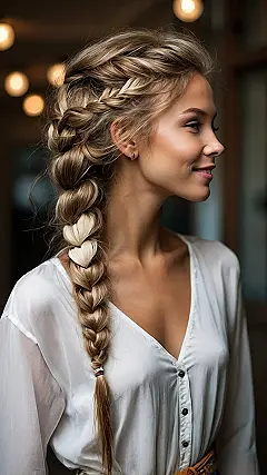 This hairstyle is seriously groovy, man! It’s like a total hippie throwback, but totally updated for the 21st century. Check out that amazing braid—long, luscious, and intricately woven. It’s not just any braid; it’s got these adorable little heart-shaped accents that add a touch of sweetness. It’s the kind of style that would totally turn heads at a music festival or even just hanging out at the mall. Seriously, if you want hair that screams “peace, love, and good vibes,” this is your jam.