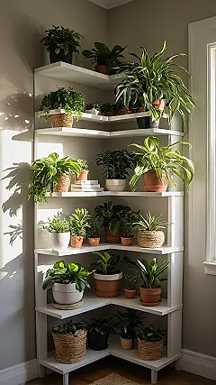 This corner is seriously living its best plant life! It looks like a multi-story plant convention happening right there on the shelf, with everything from tall, spiky guys reaching for the sun to tiny little green buddies chilling on the lower levels. They’ve basically formed their own leafy community, proving that plants aren’t just decoration – they’re throwing a silent disco party while you’re not looking, transforming a plain wall into a vibrant green masterpiece.