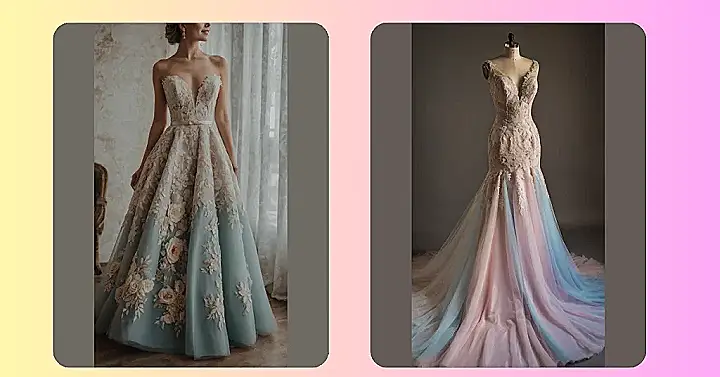 Forget what you heard about all wedding dresses being plain white, like a blank canvas waiting for a ketchup stain! This stunning number in the picture clearly got the memo that colored wedding dresses are totally in, and honestly, way more fun. With its soft pinks and dreamy blues swirling together at the bottom, it’s like a cotton candy cloud decided to become a super fancy gown. Who knew saying “I do” could look this deliciously vibrant and totally shake up tradition?