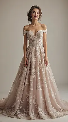 Get a load of this wedding dress! If you thought all wedding dresses had to be blindingly white, think again. This stunner is rocking a super pretty, subtle shade that’s more ‘glowing goddess’ than ‘freshly bleached sheet.’ Just look at those gorgeous lace details on the bodice and flowing skirt – they practically twinkle! It’s the kind of dress that makes you want to spin around like a princess, probably tripping a little, but totally worth it for the ‘wow’ factor.