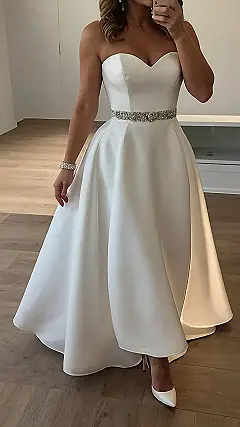 Isn’t that bridal outfit just *chef’s kiss*? It’s like someone took the elegance of a super long gown and squished it down into a fun, party-ready dress. And that sparkly belt? It’s practically shouting, “Let’s dance!” Plus, the length is perfect for showing off those killer heels. You could totally rock this at your wedding or even convince your mom to let you borrow it for prom…maybe after a little begging.