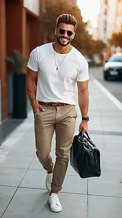 This guy is rocking the casual look. A simple white tee, some khaki pants, and a snazzy leather bag make him look like he’s ready to conquer the world, even if it’s just a trip to the coffee shop. He’s got that relaxed vibe that’s perfect for everyday wear. Plus, those white sneakers just scream “I’m cool and comfortable, and I know it!” He’s definitely got that “effortless chic” thing going on.