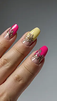 Look at these nails having a total glow-up! We’ve got some super bright pink ones, and then right there in the middle, shining like a ray of sunshine, is a gorgeous blonde nail. Yeah, you heard right, a blonde nail! It’s not just hair that gets to be blonde, you know. This one looks like it’s ready for a beach day or just chilling somewhere fabulous, maybe sipping a tiny imaginary lemonade while the pink nails are busy being all bold and bright.