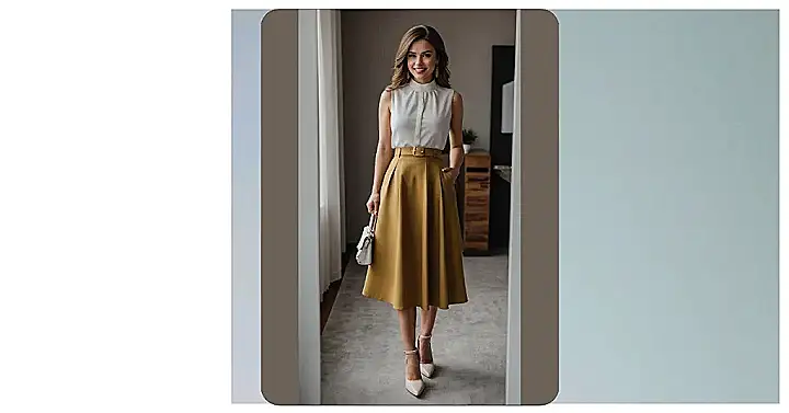 Stepping into an outfit like this must feel like putting on a superpower suit, but for conquering the office instead of supervillains. That flowing yellow skirt and crisp white top combo looks like it means business, the kind of business where you nail your presentation and then find the best place for lunch. It’s all about looking polished enough to handle important meetings, maybe even convince the vending machine to give you two snacks for the price of one. This is the uniform of someone who’s got their act together, or at least looks like they do!