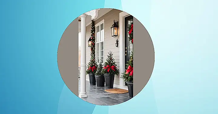 Stepping up your Christmas outdoor game doesn’t have to mean wrestling with a hundred feet of tangled lights in the snow. Just check out this porch – it’s practically giving a masterclass in festive coolness! Those mini Christmas trees are standing tall, proudly showing off their shiny ornaments and tiny glowing lights, probably feeling super important as they guard the front door. And the fancy lanterns? They’re clearly saying, “Come on in, but first, appreciate our cozy glow and excellent taste.”