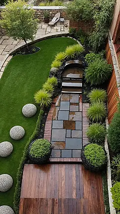 Notice how every bit of this garden is working overtime? You’ve got those spiky, bright green plants that look like they’re having a permanent good hair day, guiding you down a path that’s part fancy stepping stones, part chic wooden boardwalk – talk about a glow-up! Those giant, pebbly spheres hanging out on the grass are basically the garden’s cool kids, adding a touch of modern art without trying too hard. This isn’t just a garden; it’s a masterclass in making a smaller space feel like a grand adventure, proving you can pack serious personality and chill vibes into any nook or cranny.