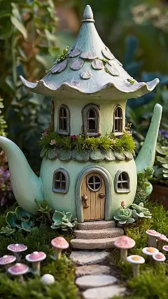 Imagine living in a teapot! This isn’t your grandma’s tea set; it’s a cozy fairy mansion complete with a stone path leading right to the front door. Forget sharing a dorm room – time to build your own epic fairy garden with houses like this. Who needs a real house when you can live in a teapot with mushroom neighbors?