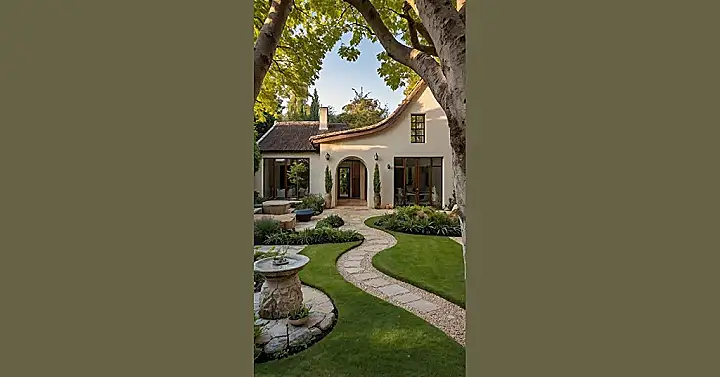 Whoever designed this place clearly understood the assignment of “dreamy home garden,” because wow! That winding stone path with the little gravel bits looks like it’s inviting you on a grand adventure, or at least a very chill walk to the front door. The house itself has such a cool, curvy roof that it practically looks like it’s smiling, and honestly, the whole vibe just screams “no homework allowed, only good vibes.” I bet the plants here have their own social media accounts because they are looking incredibly photogenic, ready for their close-up at any moment.