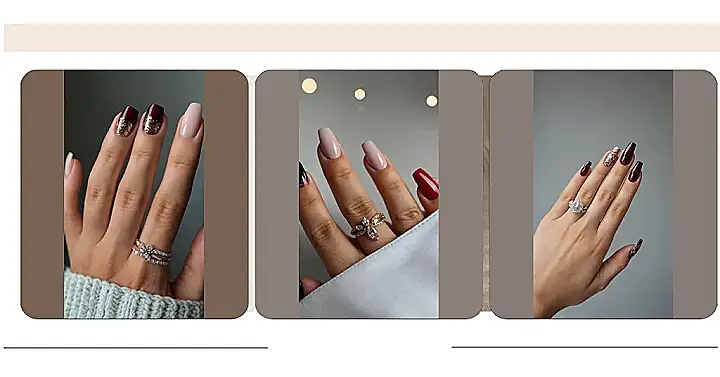 These nails are totally rocking the burgundy look! It’s like a fancy wine color, but for your fingertips. And those sparkly rings? They’re like the cherry on top of a super-delicious nail sundae. It’s giving “I’m ready for anything” vibes, but also “don’t mess with me, I’m fabulous.” They’re totally the kind of nails you’d wear to a fancy party or to school, because you know they’ll make you feel like a million bucks!