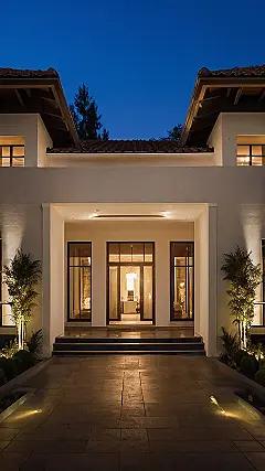 This picture shows a stunning example of what a luxurious Mediterranean home can be. The clean lines and simple design of the house are beautiful and modern, but the warm lighting and the lush greenery surrounding the entrance give it a relaxed and inviting vibe. It’s like stepping into a relaxing oasis, with a cool breeze and the sound of the ocean in the distance (even if the ocean is just a figment of your imagination)!