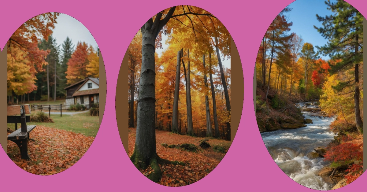 This picture is like a scene straight out of a storybook! Imagine you’re walking through a forest on a crisp autumn day. The trees are dressed in their finest fall colours: reds, yellows, and oranges. You come across a little bench, perfect for taking a break and soaking in the beauty around you. The ground is covered in a thick blanket of fallen leaves, crunching under your feet. The air smells like damp earth and woodsmoke, and you can almost hear the leaves rustling in the gentle breeze. It’s the kind of place where you could easily spend hours just relaxing and watching the world go by.