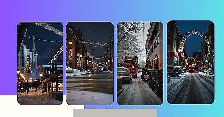 But wait, there’s more! Check out that charming street lined with beautifully decorated homes, each one trying to outdo the next with its festive cheer! It looks cozy and warm despite the winter chill, making you want to grab a hot chocolate and curl up by the fireplace. The whole scene just screams “Christmas in Canada,” full of festive magic and winter wonderland vibes. It’s enough to make even the grumpiest Grinch crack a smile – especially if that trolley bus is heading straight to a giant Christmas party!